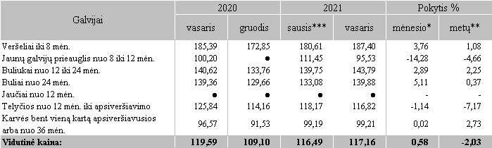Vidutinės kainos skaičiuojamos svertiniu būdu, įskaitant įmonių ir (arba) ūkių supirktų galvijų, skerdžiamų pagal paslaugą kitoje skerdykloje, vertę.