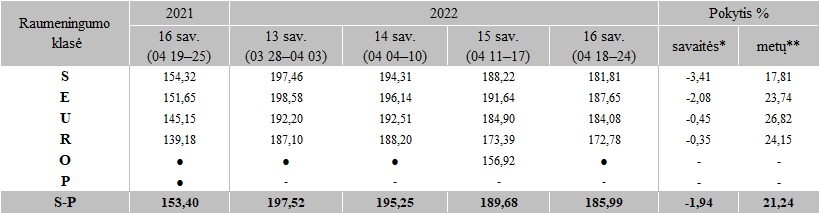 Kiaulių supirkimo kainos Lietuvos įmonėse 2022 m. 13–16 sav., EUR/100 kg skerdenų (be PVM)