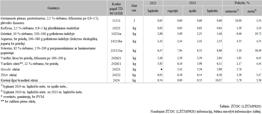 Kai kurių Lietuvos įmonėse pagamintų pieno gaminių vidutinės pardavimo kainos* vidaus rinkoje (2024 m. lapkričio mėn.), EUR/mat. vnt. (pagal PS-1 ataskaitą)