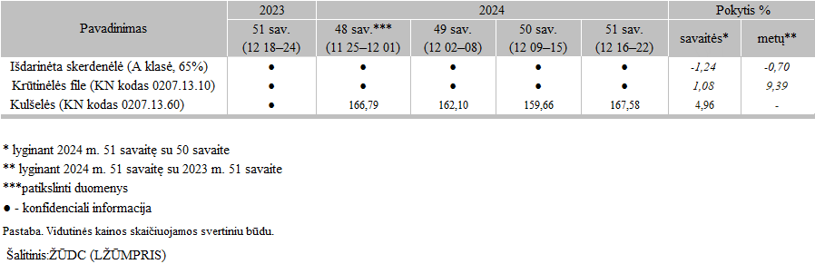 Viščiukų broilerių skerdenų ir gabalų pardavimo vidutinės didmeninės kainos Lietuvos įmonėse 2024 m. 48–51 sav. EUR/100 kg (be PVM)