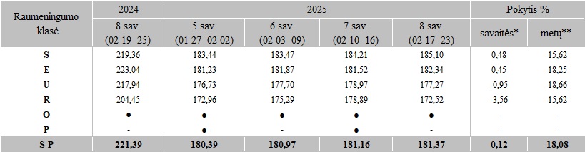 Kiaulių supirkimo kainos Lietuvos įmonėse 2025 m. 5–8 sav., EUR/100 kg skerdenų (be PVM)