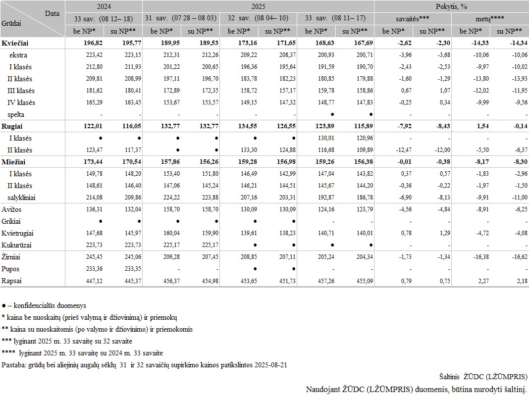 Grūdų supirkimo kainos (iš augintojų ir kitų vidaus rinkos ūkio subjektų) Lietuvoje 2025 m. 31–33 sav., EUR/t (be PVM)