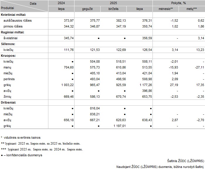Grūdų produktų pardavimo kainos* (gamintojų) Lietuvoje 2025 m. liepos mėn., EUR/t (be PVM)