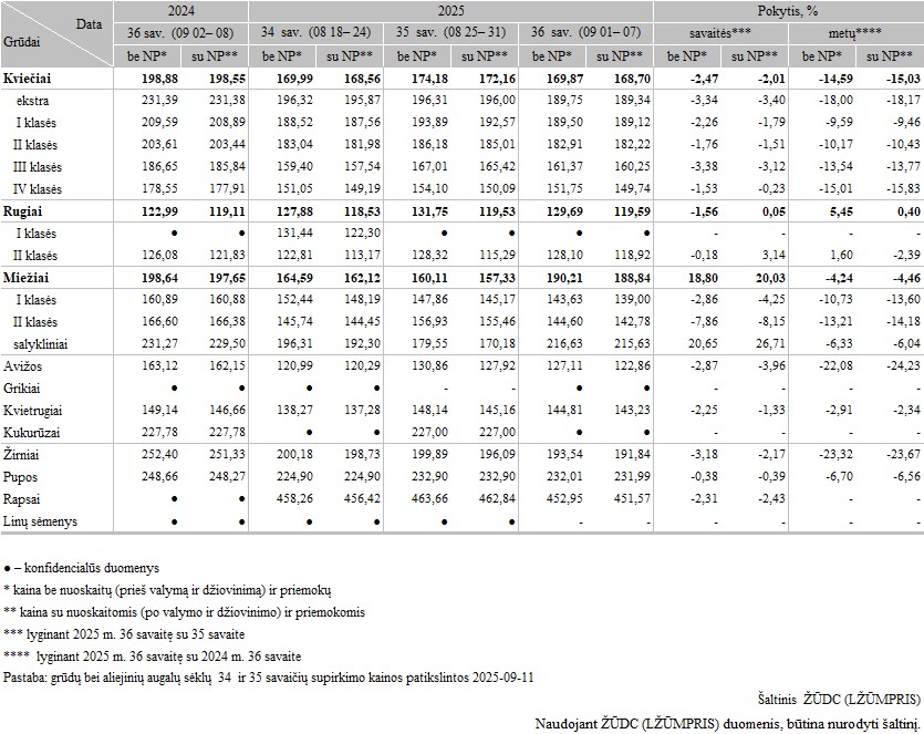 Grūdų supirkimo kainos (iš augintojų ir kitų vidaus rinkos ūkio subjektų) Lietuvoje 2025 m. 34–36 sav., EUR/t (be PVM)