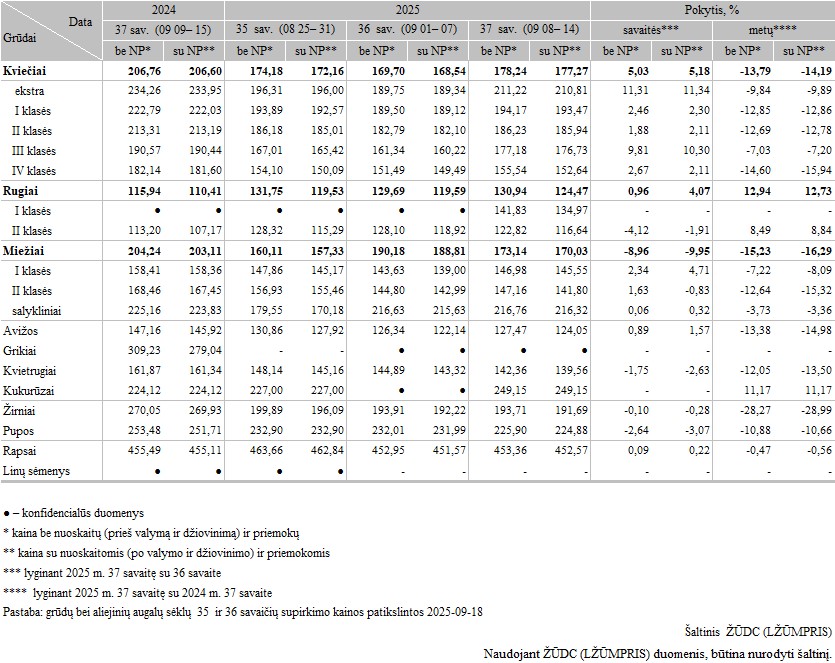 Grūdų supirkimo kainos (iš augintojų ir kitų vidaus rinkos ūkio subjektų) Lietuvoje 2025 m. 35–37 sav., EUR/t (be PVM)