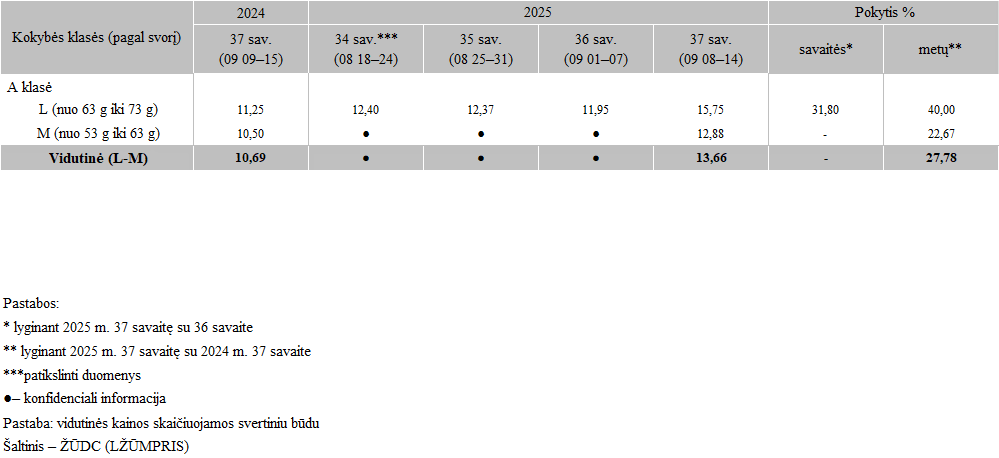 Ant kraiko laikomų vištų kiaušinių pardavimo vidutinės didmeninės kainos Lietuvos įmonėse 2025 m. 34–37 sav. EUR/100 vnt. (be PVM)