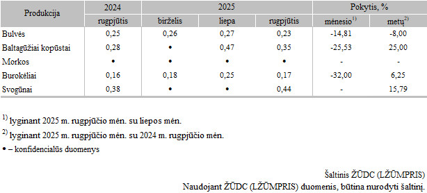 Bulvių ir daržovių supirkimo iš Lietuvos augintojų perdirbimui kainos 2025 m. birželio–rugpjūčio mėn., EUR/kg (be PVM)