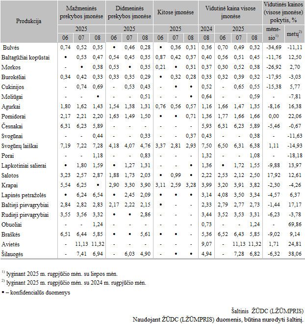 Bulvių, daržovių, pievagrybių, vaisių ir uogų supirkimo iš Lietuvos augintojų šviežiam vartojimui kainos 2025 m. birželio–rugpjūčio mėn., EUR/kg (be PVM)