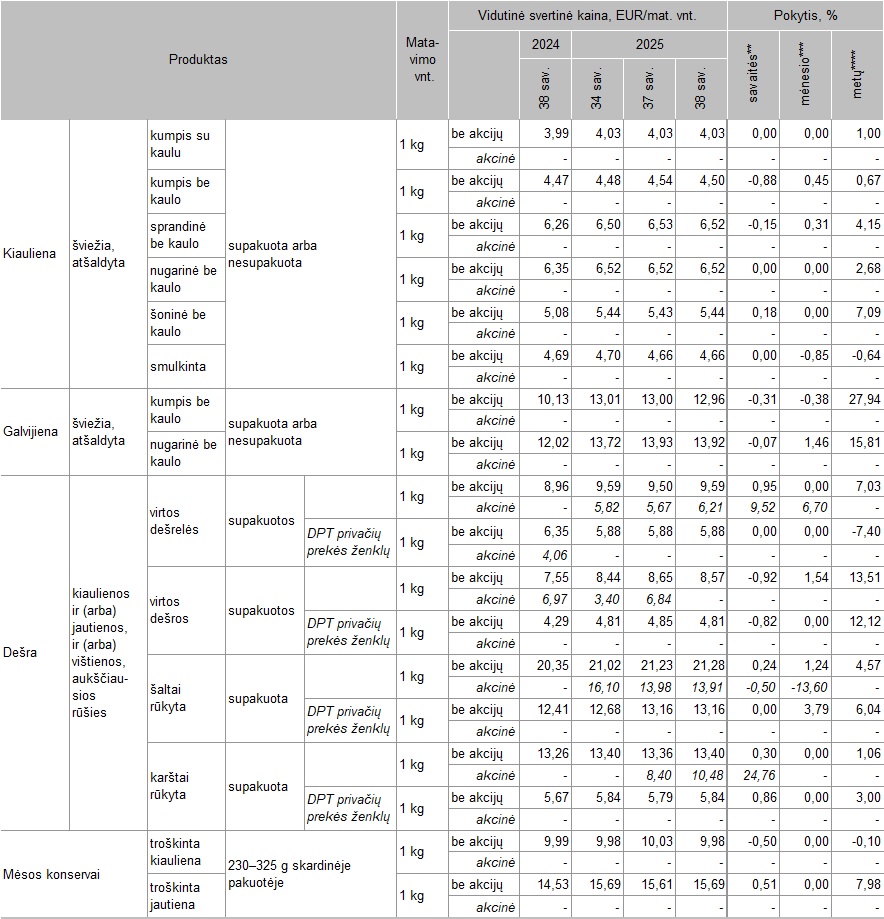 Mėsos produktų vidutinės mažmeninės kainos Lietuvos didžiųjų prekybos tinklų (DPT) parduotuvėse* 2024–2025 m. 38 sav.