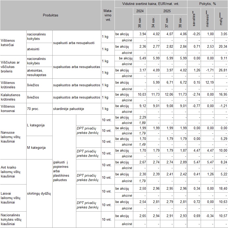 Paukštienos produktų ir kiaušinių vidutinės mažmeninės kainos Lietuvos didžiųjų prekybos tinklų (DPT) parduotuvėse* 2024–2025 m. 38 sav.