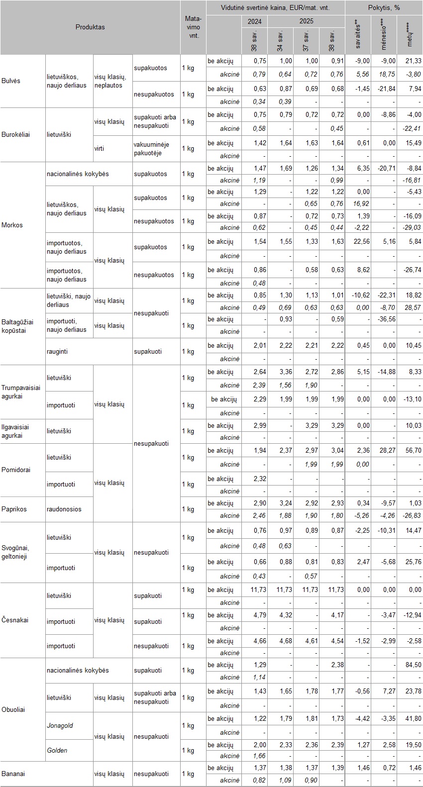 Bulvių, daržovių ir vaisių vidutinės mažmeninės kainos Lietuvos didžiųjų prekybos tinklų parduotuvėse* 2024–2025 m. 38 sav.