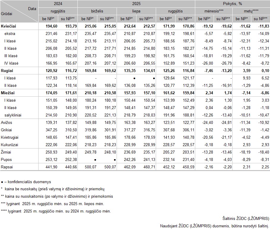 Grūdų ir rapsų vidutinės supirkimo kainos (iš augintojų ir kitų vidaus rinkos ūkio subjektų) Lietuvoje 2025 m. rugpjūčio mėn., EUR/t (be PVM)