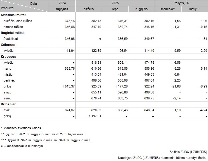 Grūdų produktų pardavimo kainos* (gamintojų) Lietuvoje 2025 m. rugpjūčio mėn., EUR/t (be PVM)