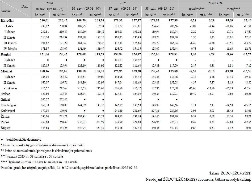 Grūdų supirkimo kainos (iš augintojų ir kitų vidaus rinkos ūkio subjektų) Lietuvoje 2025 m. 36–38 sav., EUR/t (be PVM)