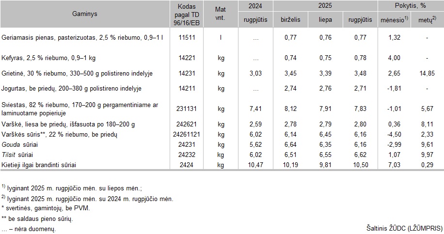 Kai kurių Lietuvos įmonėse pagamintų pieno gaminių vidutinės pardavimo kainos* vidaus rinkoje (2025 m. rugpjūčio mėn.), EUR/mat. vnt. (pagal PS-1 ataskaitą)