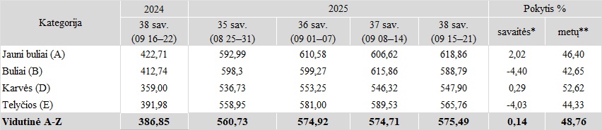 Galvijų supirkimo kainos Lietuvos įmonėse 2025 m. 35–38 sav., EUR/100 kg skerdenų (be PVM)