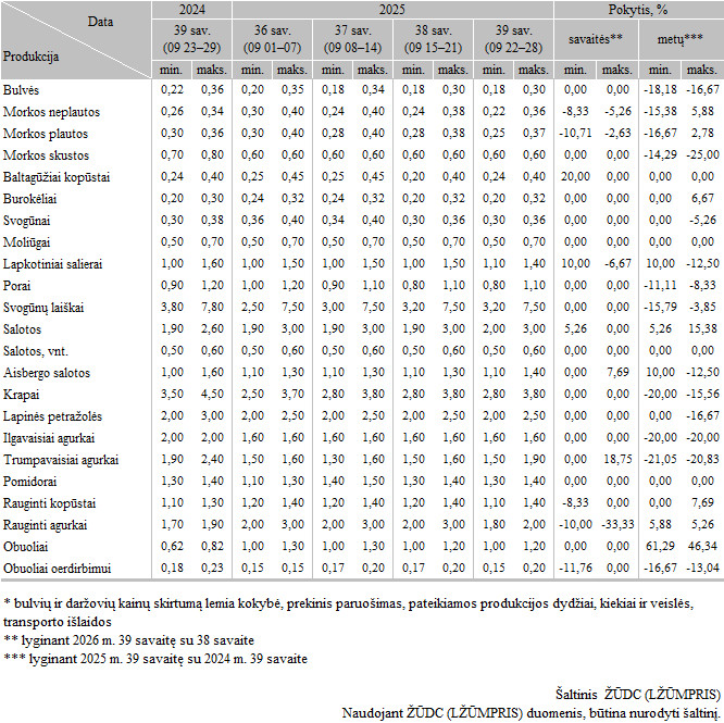 Bulvių, daržovių ir obuolių vidutinės pardavimo kainos Lietuvos prekiniuose ūkiuose ir šiltnamiuose 2025 m. (36–39 sav.), EUR/kg (be PVM)*