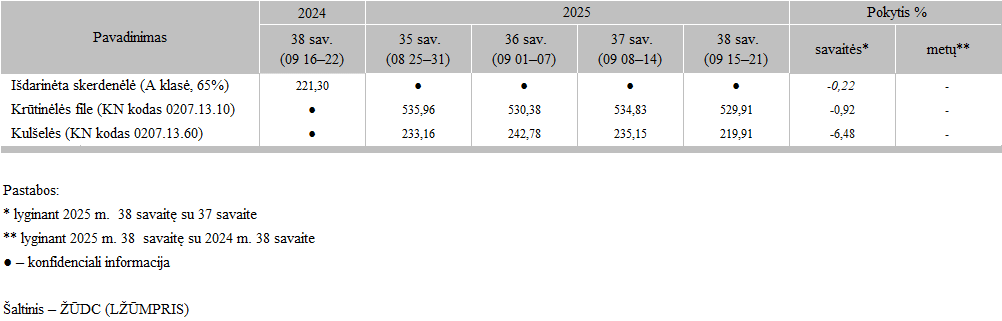Viščiukų broilerių skerdenų ir gabalų pardavimo vidutinės didmeninės kainos Lietuvos įmonėse 2025 m. 35–38 sav. EUR/100 kg (be PVM)