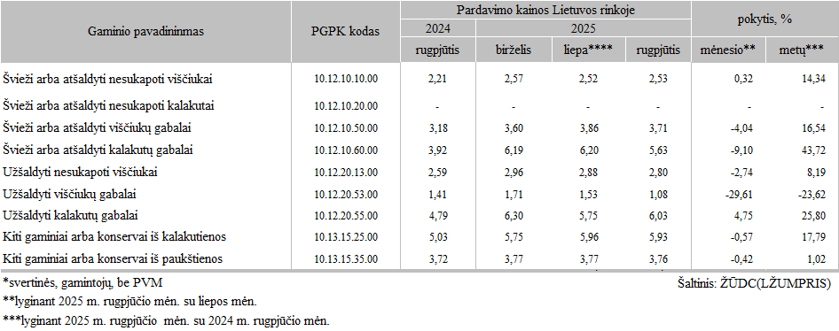 Kai kurių Lietuvos įmonėse pagamintų paukštienos gaminių vidutinės pardavimo kainos 2025 m. liepos–rugpjūčio mėn. EUR/kg