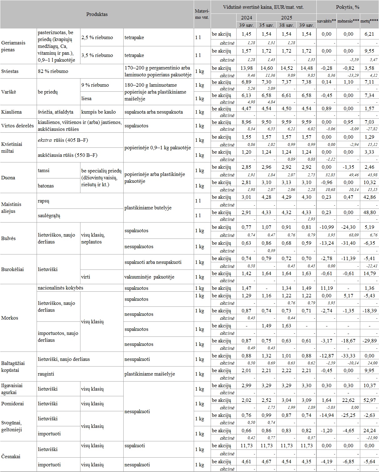 * kainos registruojamos Vilniaus, Kauno, Šiaulių, Panevėžio ir Alytaus miestų UAB „Lidl Lietuva“, UAB „Maxima LT“, UAB „Norfos mažmena“, UAB „IKI Lietuva“ ir UAB „Rimi Lietuva“ prekybos tinklų parduotuvėse. Apskaičiuojant vidutines mažmenines produktų kainas, neįtraukiamos prekybos tinklų privačių prekių ženklų produktų kainos.