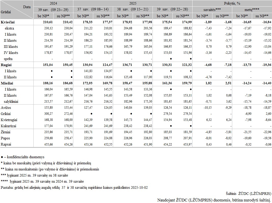Grūdų supirkimo kainos (iš augintojų ir kitų vidaus rinkos ūkio subjektų) Lietuvoje 2025 m. 37–39 sav., EUR/t (be PVM)