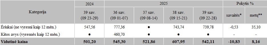 Avių kainos Lietuvos įmonėse 2025 m. 36-39 sav., EUR/100 kg skerdenų (be PVM)