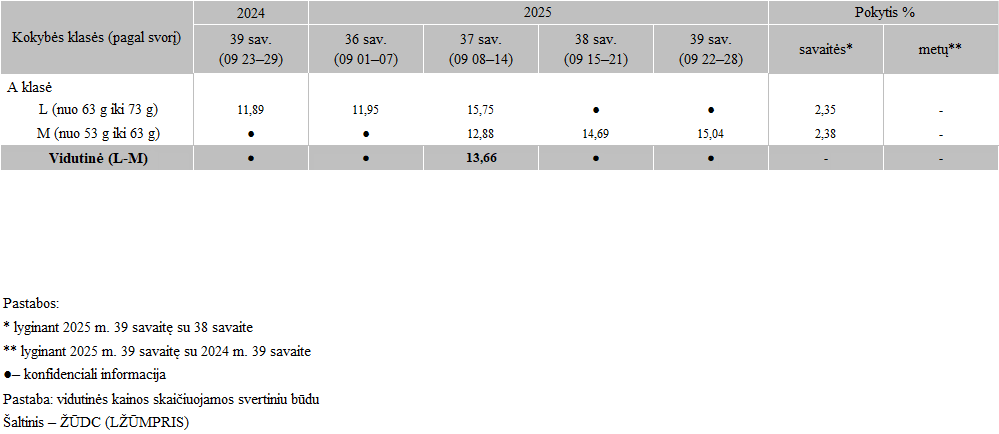 Ant kraiko laikomų vištų kiaušinių pardavimo vidutinės didmeninės kainos Lietuvos įmonėse 2025 m. 36–39 sav. EUR/100 vnt. (be PVM)
