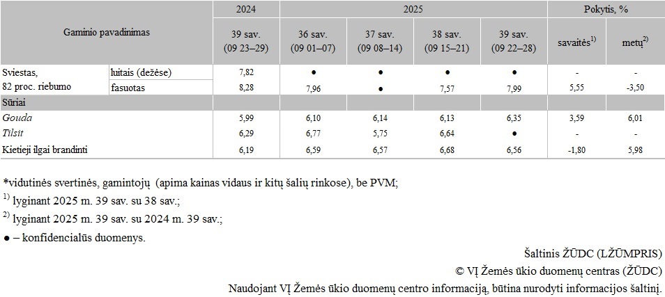 Kai kurių Lietuvos pieno perdirbimo įmonėse pagamintų pieno gaminių pardavimo kainos* 2025 m. 36–39 sav., EUR/kg