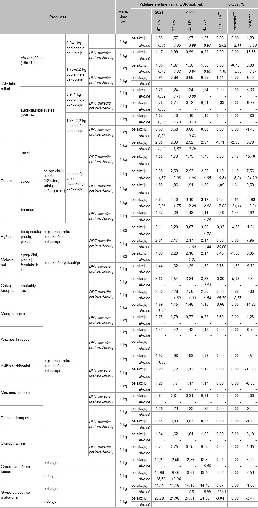 Grūdų produktų vidutinės mažmeninės kainos Lietuvos didžiųjų prekybos tinklų (DPT) parduotuvėse* 2024–2025 m. 40 sav.