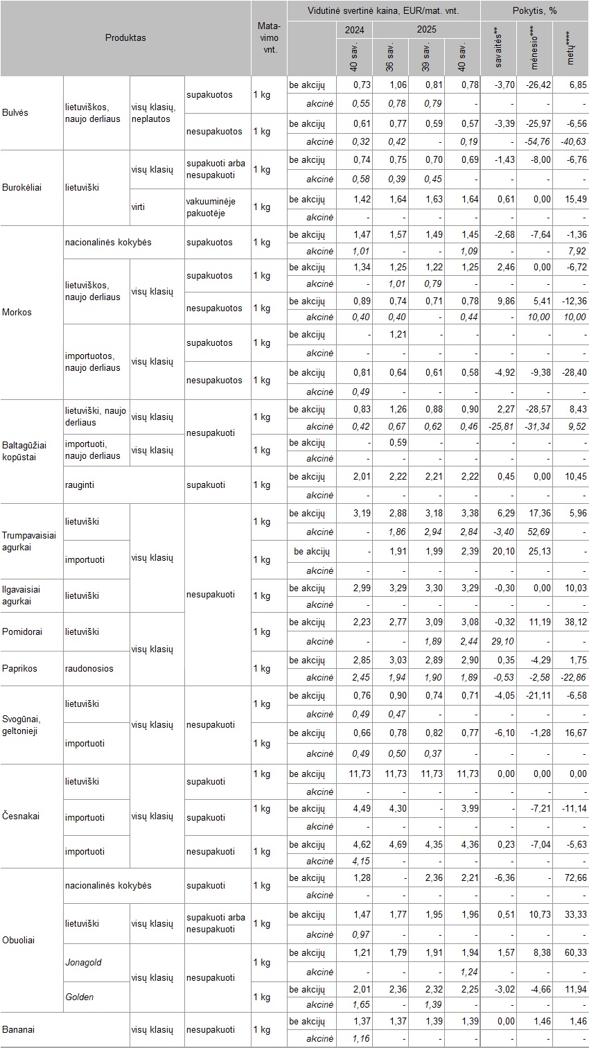 Bulvių, daržovių ir vaisių vidutinės mažmeninės kainos Lietuvos didžiųjų prekybos tinklų parduotuvėse* 2024–2025 m. 40 sav.