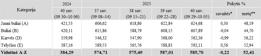 Galvijų supirkimo kainos Lietuvos įmonėse 2025 m. 37–40 sav., EUR/100 kg skerdenų (be PVM)