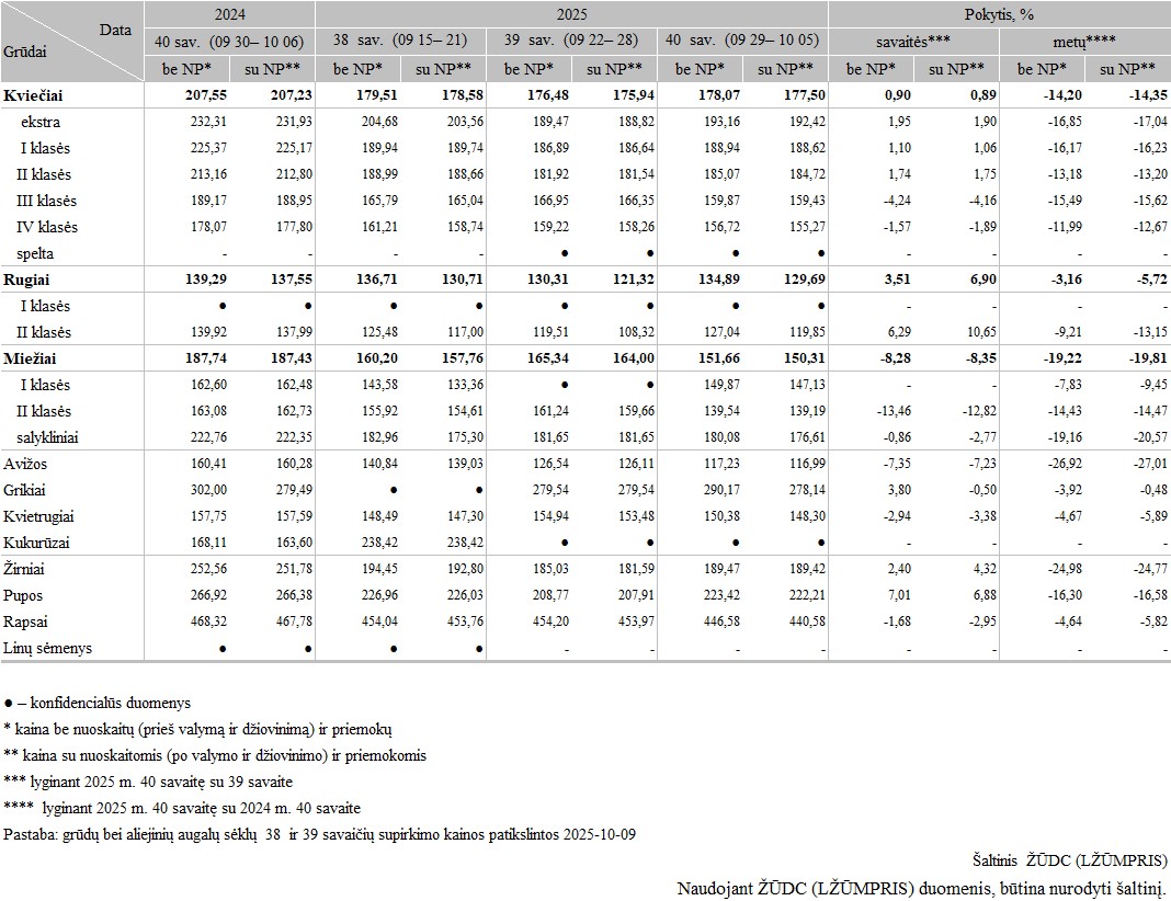 Grūdų supirkimo kainos (iš augintojų ir kitų vidaus rinkos ūkio subjektų) Lietuvoje 2025 m. 38–40 sav., EUR/t (be PVM)