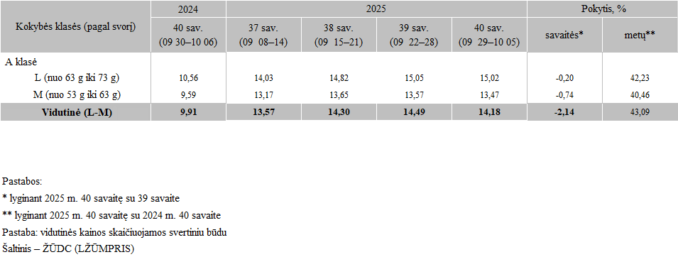Narvuose laikomų vištų kiaušinių pardavimo vidutinės didmeninės kainos Lietuvos įmonėse 2025 m. 37–40 sav. EUR/100 vnt. (be PVM)