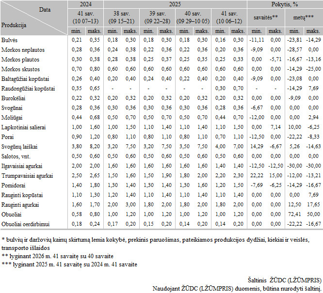 Bulvių, daržovių ir obuolių vidutinės pardavimo kainos Lietuvos prekiniuose ūkiuose ir šiltnamiuose 2025 m. (38–41 sav.), EUR/kg (be PVM)*