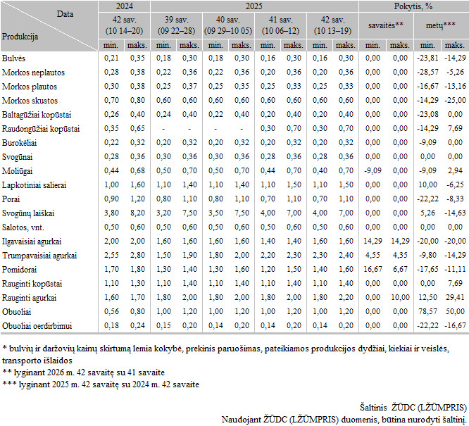 Bulvių, daržovių ir obuolių vidutinės pardavimo kainos Lietuvos prekiniuose ūkiuose ir šiltnamiuose 2025 m. (39–42 sav.), EUR/kg (be PVM)*