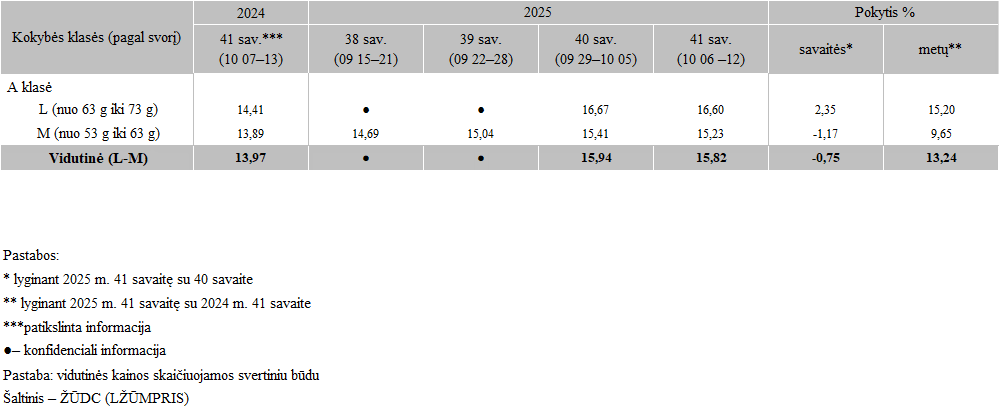 Ant kraiko laikomų vištų kiaušinių pardavimo vidutinės didmeninės kainos Lietuvos įmonėse 2025 m. 38–41 sav. EUR/100 vnt. (be PVM)