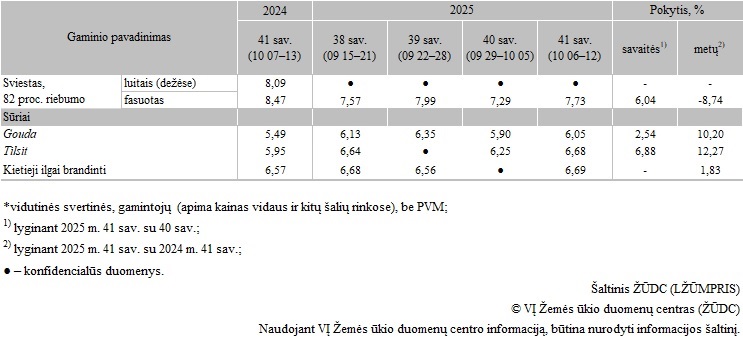Kai kurių Lietuvos pieno perdirbimo įmonėse pagamintų pieno gaminių pardavimo kainos* 2025 m. 38–41 sav., EUR/kg