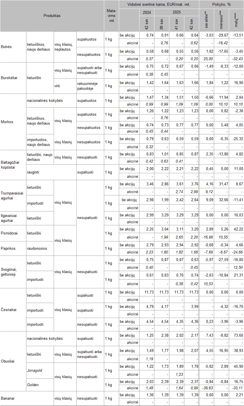 | Bulvių, daržovių ir vaisių vidutinės mažmeninės kainos Lietuvos didžiųjų prekybos tinklų parduotuvėse* 2024–2025 m. 42 sav. 2025-10-20