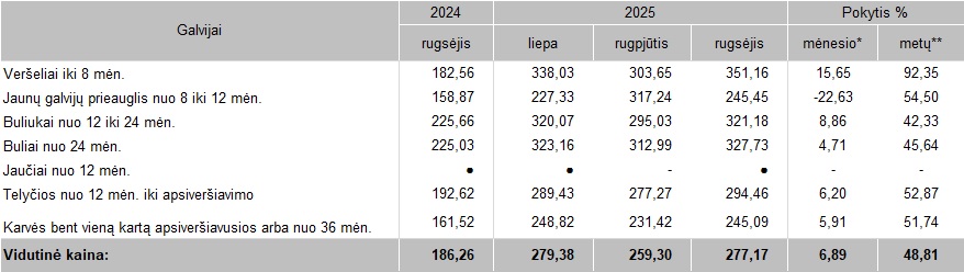 Galvijų supirkimo kainos Lietuvos įmonėse 2025 m. liepos–rugsėjo mėn., EUR/100 kg gyvojo svorio (be PVM)