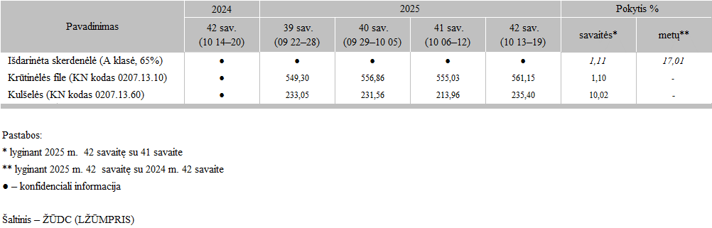 Viščiukų broilerių skerdenų ir gabalų pardavimo vidutinės didmeninės kainos Lietuvos įmonėse 2025 m. 39–42 sav. EUR/100 kg (be PVM)