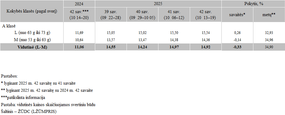 Narvuose laikomų vištų kiaušinių pardavimo vidutinės didmeninės kainos Lietuvos įmonėse 2025 m. 39–42 sav. EUR/100 vnt. (be PVM)