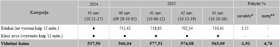 Avių kainos Lietuvos įmonėse 2025 m. 40-43 sav., EUR/100 kg skerdenų (be PVM)