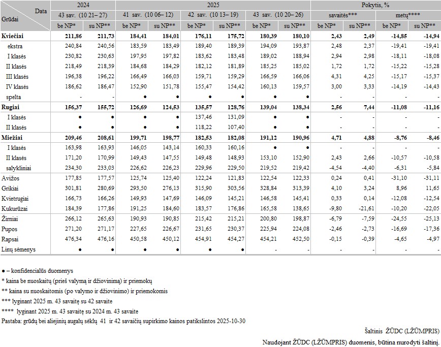 Grūdų supirkimo kainos (iš augintojų ir kitų vidaus rinkos ūkio subjektų) Lietuvoje 2025 m. 41–43 sav., EUR/t (be PVM)