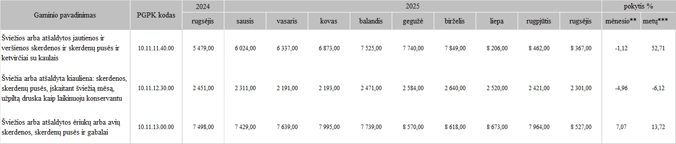 Kai kurių Lietuvos įmonėse pagamintų mėsos gaminių vidutinės pardavimo kainos* Lietuvos rinkoje 2025 m. sausio-rugsėjo mėn. ir 2024 m. rugsėjo mėn., EUR/t