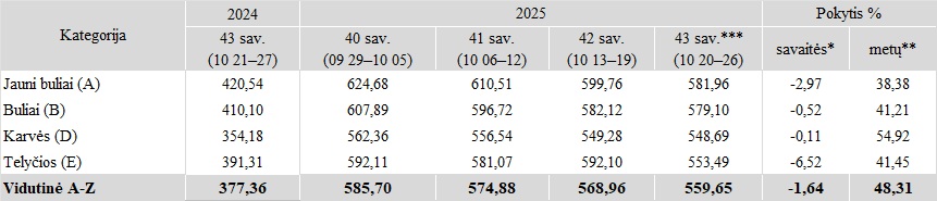 Galvijų supirkimo kainos Lietuvos įmonėse 2025 m. 40–43 sav., EUR/100 kg skerdenų (be PVM)