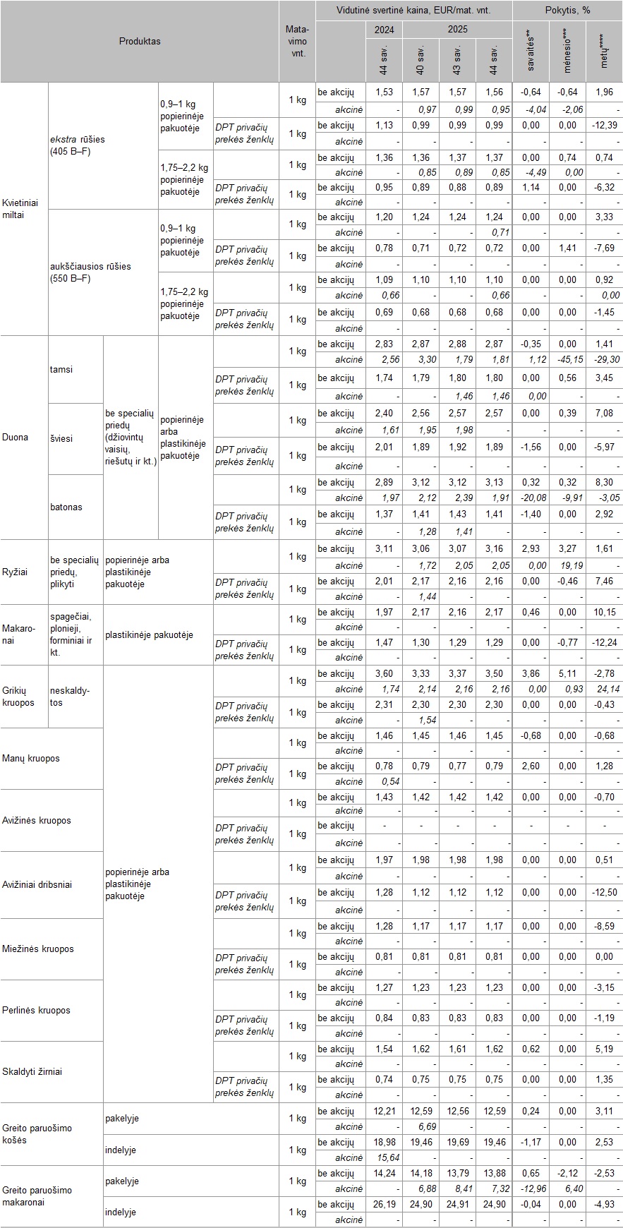 * kainos registruojamos Vilniaus, Kauno, Klaipėdos, Panevėžio ir Marijampolės miestų UAB „Lidl Lietuva“, UAB „Maxima LT“, UAB „Norfos mažmena“, UAB „IKI Lietuva“ ir UAB „Rimi Lietuva“ prekybos tinklų parduotuvėse