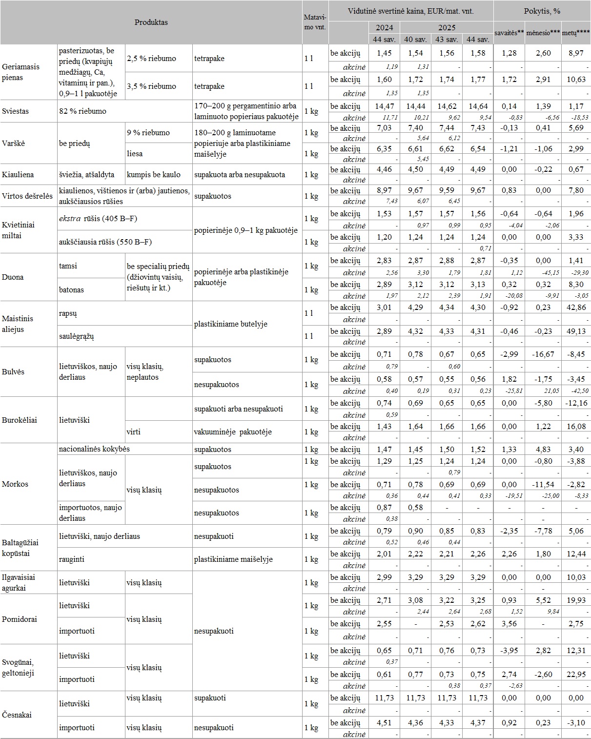 * kainos registruojamos Vilniaus, Kauno, Klaipėdos, Panevėžio ir Marijampolės miestų UAB „Lidl Lietuva“, UAB „Maxima LT“, UAB „Norfos mažmena“, UAB „IKI Lietuva“ ir UAB „Rimi Lietuva“ prekybos tinklų parduotuvėse. Apskaičiuojant vidutines mažmenines produktų kainas, neįtraukiamos prekybos tinklų privačių prekių ženklų produktų kainos.