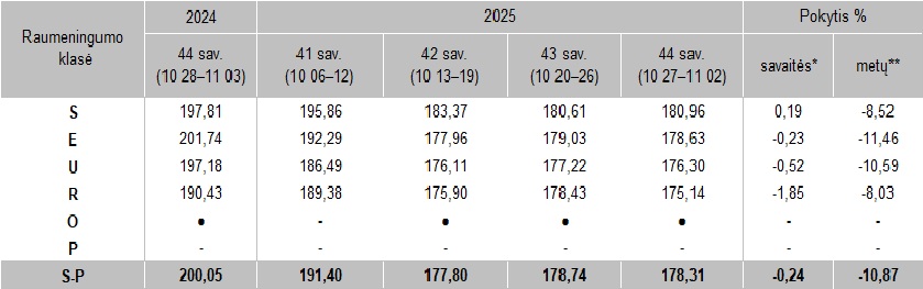 Kiaulių supirkimo kainos Lietuvos įmonėse 2025 m. 41–44 sav., EUR/100 kg skerdenų (be PVM)