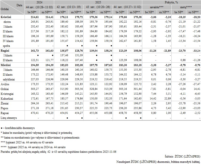 Grūdų supirkimo kainos (iš augintojų ir kitų vidaus rinkos ūkio subjektų) Lietuvoje 2025 m. 42–44 sav., EUR/t (be PVM)