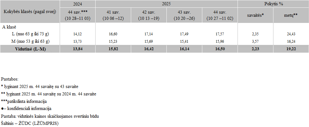 Ant kraiko laikomų vištų kiaušinių pardavimo vidutinės didmeninės kainos Lietuvos įmonėse 2025 m. 41–44 sav. EUR/100 vnt. (be PVM)